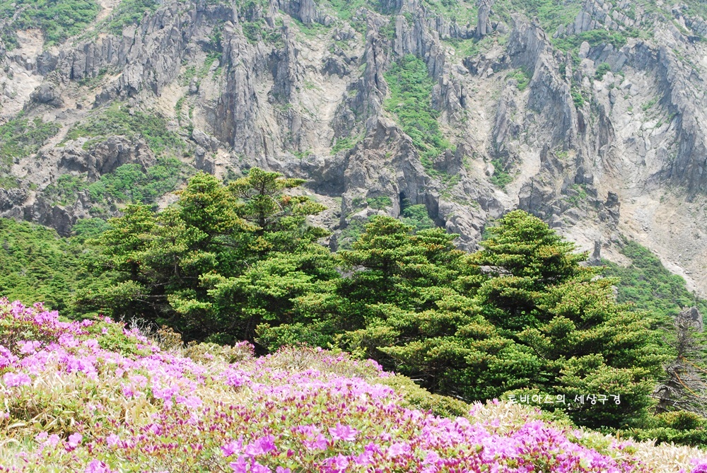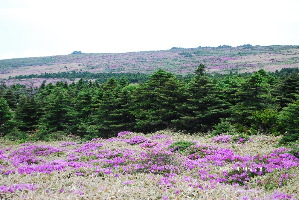 백록담을 가기 위해 성판악 탐방로로 오르다 보면 진달래밭 대피소를 지나면서부터 상록수들 사이를 지나게 됩니다.