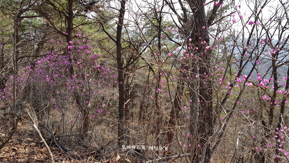 삼나무 사이 진달래들이 제법 많이 피었습니다.