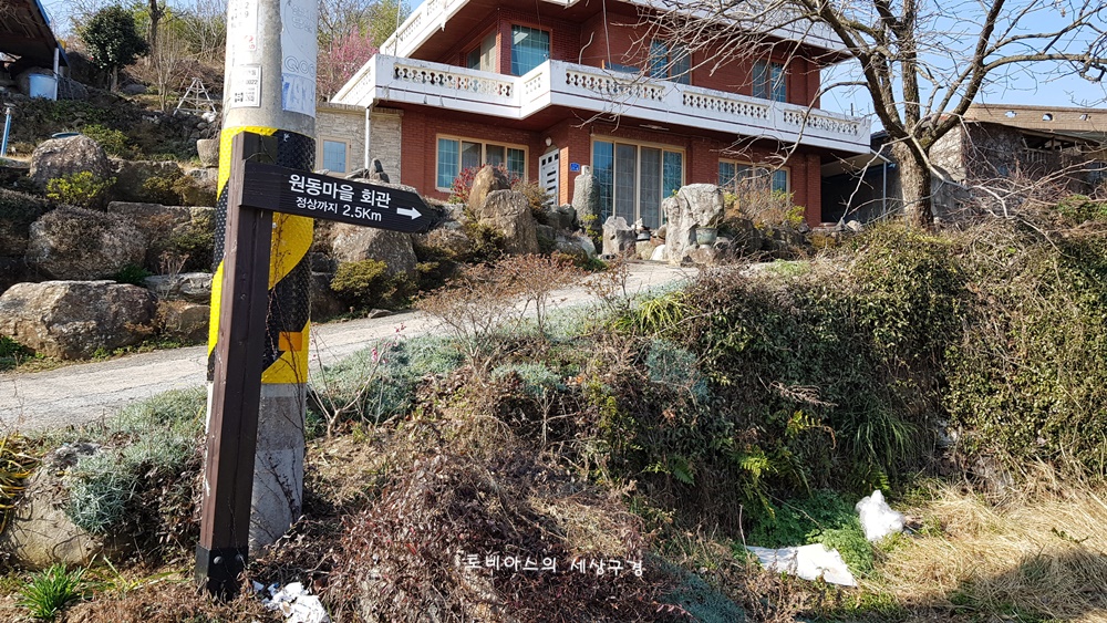 주변이 죄 카페나 음식점이라 차를 세우기 애매해 원동마을 회관까지 올라갑니다.