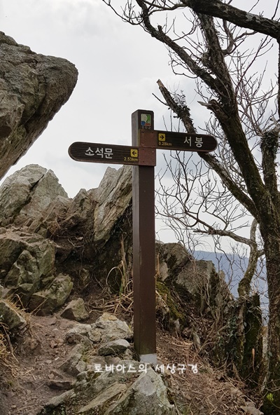동봉에서 서봉까지 200m라 표시된 이정표가 서있습니다.