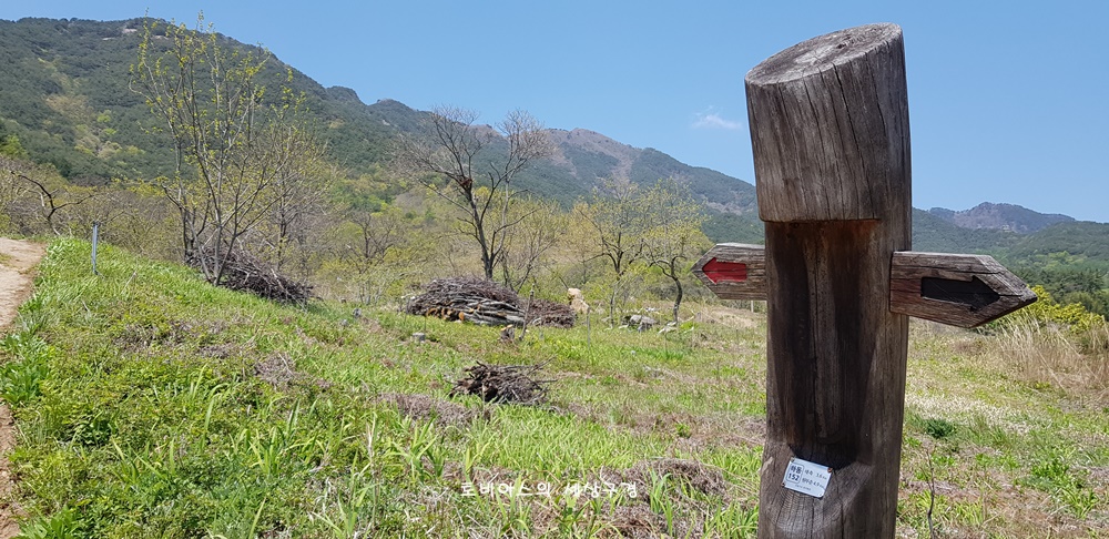 지리산 둘레길 이정표 뒤로 보이는 형제봉 능선