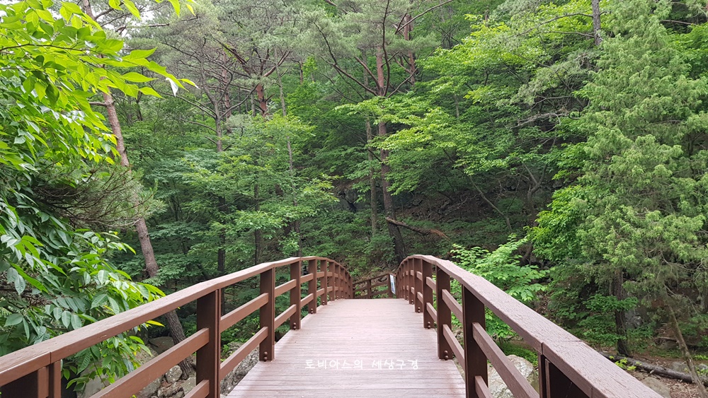 가로막힌 문앞에서 왼쪽으로 돌아 계곡을 건넙니다.