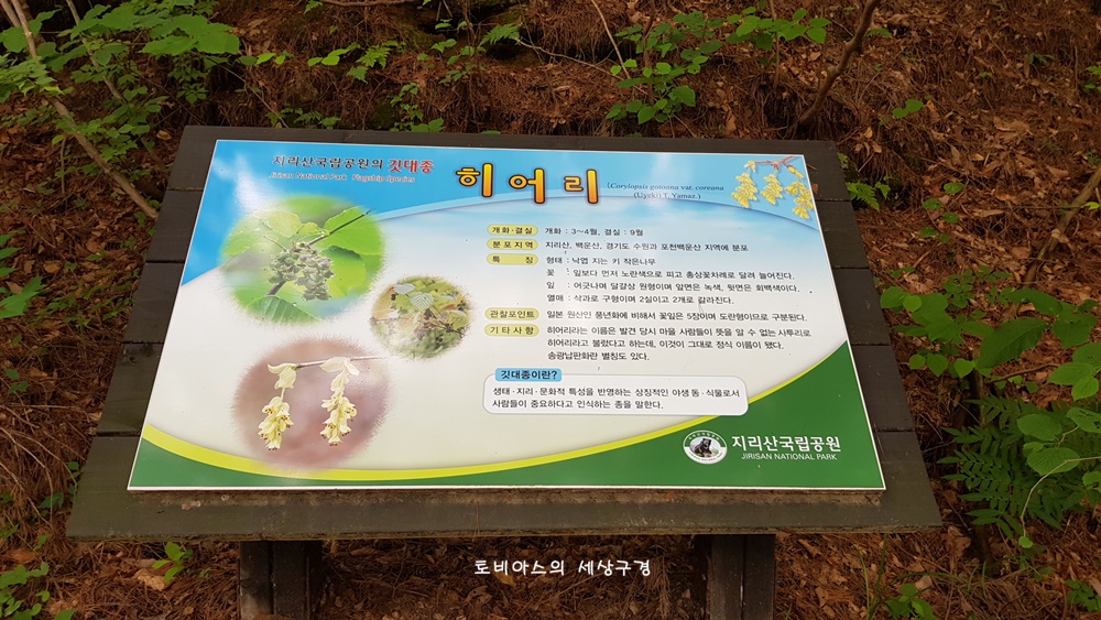 지리산 국립공원의 깃대종 히어리를 소개하는 안내판이 보입니다.