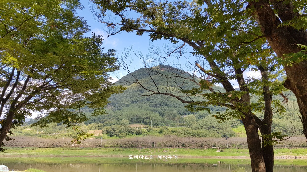길 건너편에 삼각형으로 솟은 봉우리가 오산이고,